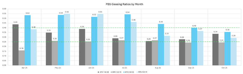 The impact is clear. Between July and October 2025, gassing ratios across all sites steadily converged toward the expected 0.40-0.25 range – a strong indicator that the new processes and training are delivering exactly the consistency we set out to achieve.